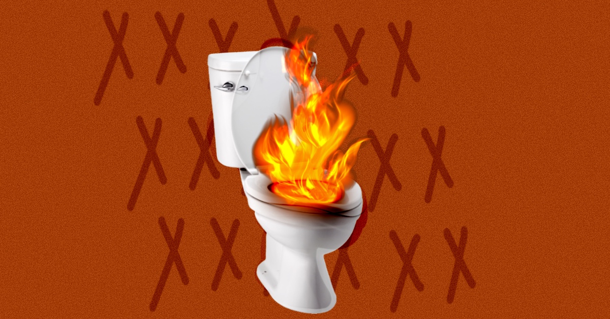 A toilet bowl on fire with a red background filled with X's.