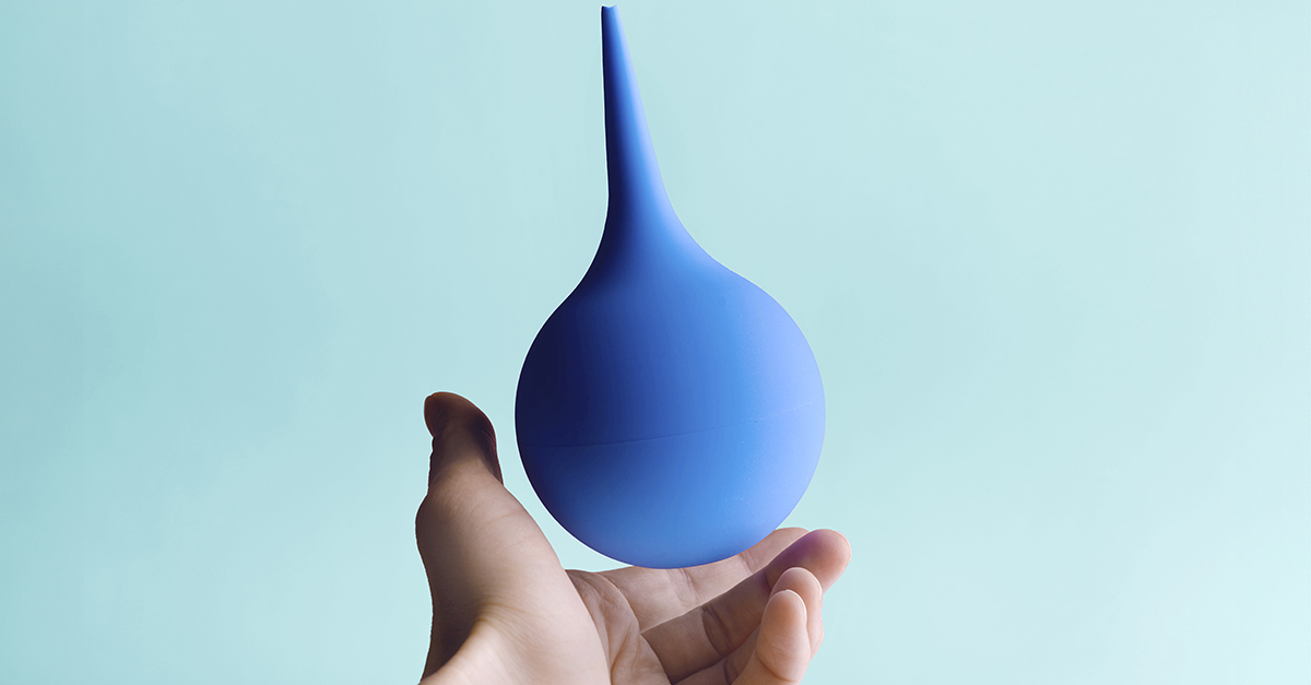 - Douche bulbs. They are reusable rubber bulbs with a nozzle on one end that's inserted into the rectum. The bulb is filled with water or another similar safe solution such as saline.