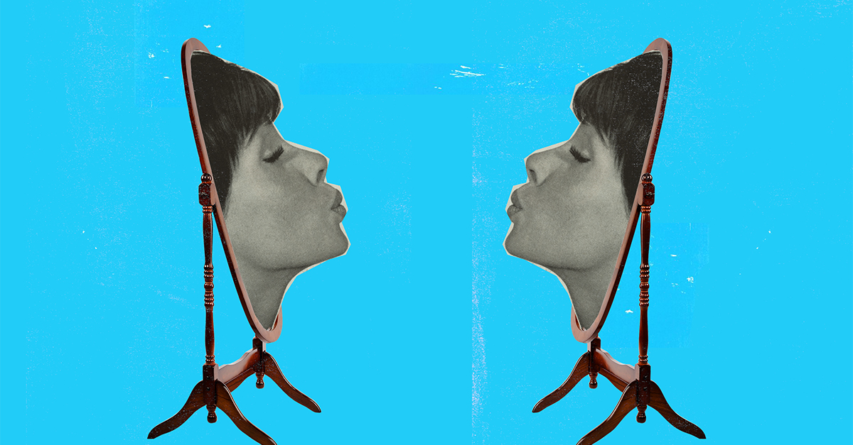 twin faces coming out of a mirror looking at each other on a blue background