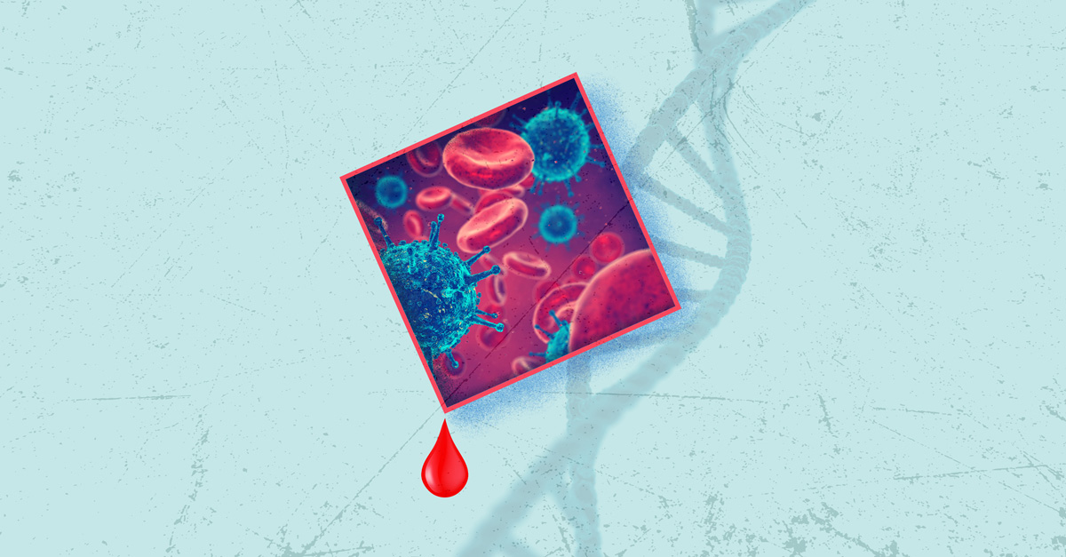 A square with the cells of an HIV infected patient is against a light blue background with a DNA strand.
