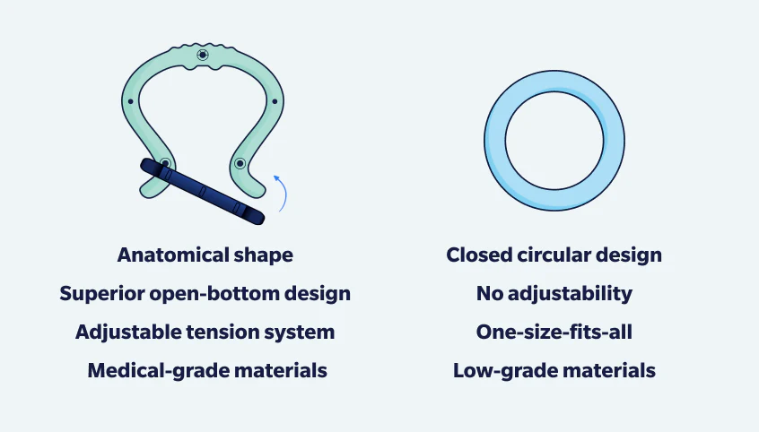 Eddie isn’t just a ring with fancy packaging. In fact it’s not a ring at all, it’s an FDA Class II Medical Device. That means it’s held to the same safety and performance standards as legitimate medical tools, unlike unregulated sex toys. The design uses controlled tension and open geometry to support blood flow safely, without cutting off circulation or causing numbness. It’s the kind of detail you only see when real engineers and physicians are involved, not drop-shippers slinging silicone loops.