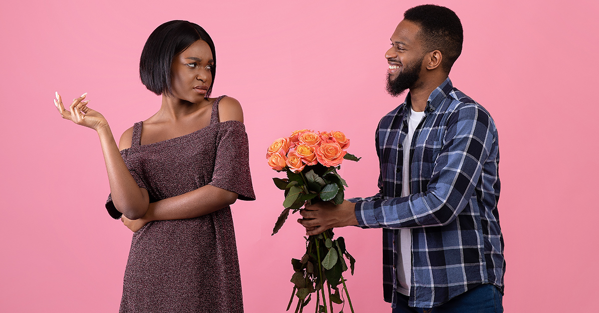 A man tries to give flowers to a woman while she is scowling at him.