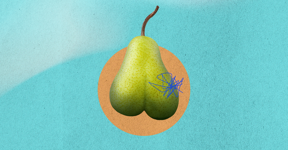 green pear with blue scribbled over one side on a teal background