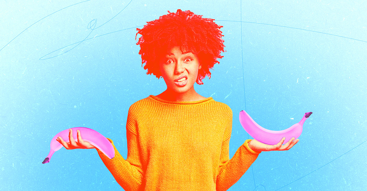 woman in yellow shirt holds two pink bananas in each hand one erect one downturned and looks confused on blue background
