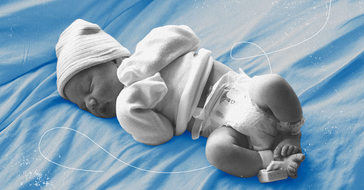 A greyscale newborn lays against a blue blanket.