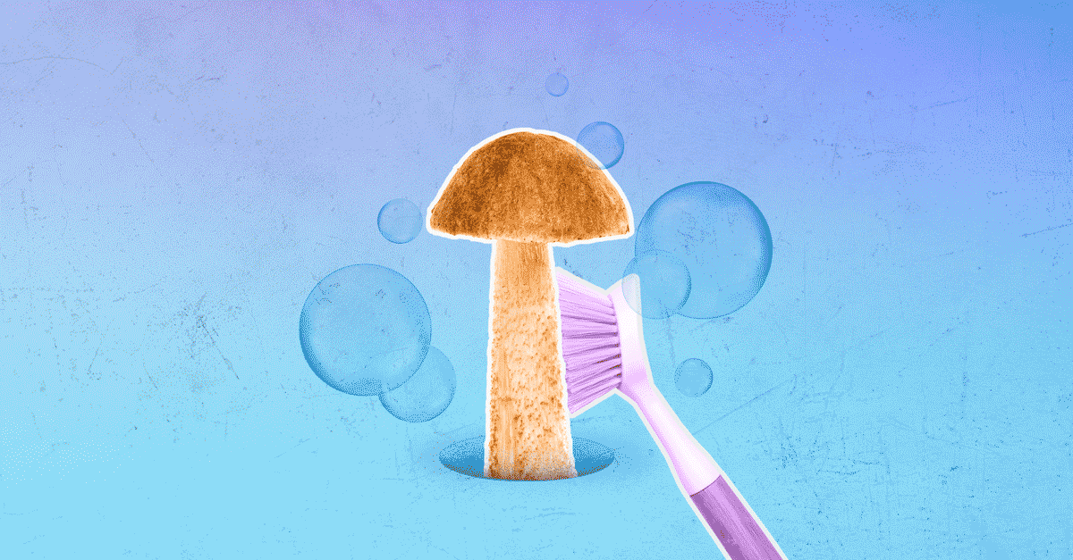 purple toothbrush scrubs mushroom on blue background with bubbles